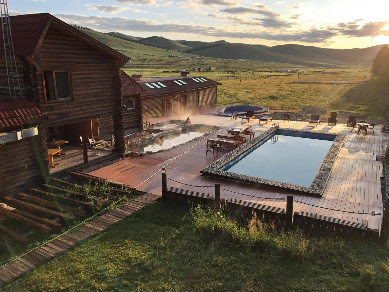Après une matinée libre aux chutes (une petite balade à cheval est possible), nous prenons une piste sauvage dans les massifs verdoyants des montagnes de Khangaї. Cette région reculée, située entre 2000 et 2500 m d’altitude offre des paysages splendides. Déjeuner en bivouac. Au milieu d’une jolie vallée boisée, nous atteindrons les sources chaudes de Tsenkher, renommées pour leurs vertus curatives. Quoi de mieux, pour récupérer des fatigues de la journée, que de s’offrir un bon bain chaud et une douce soirée de détente… Dîner et nuit dans un camp de yourtes.