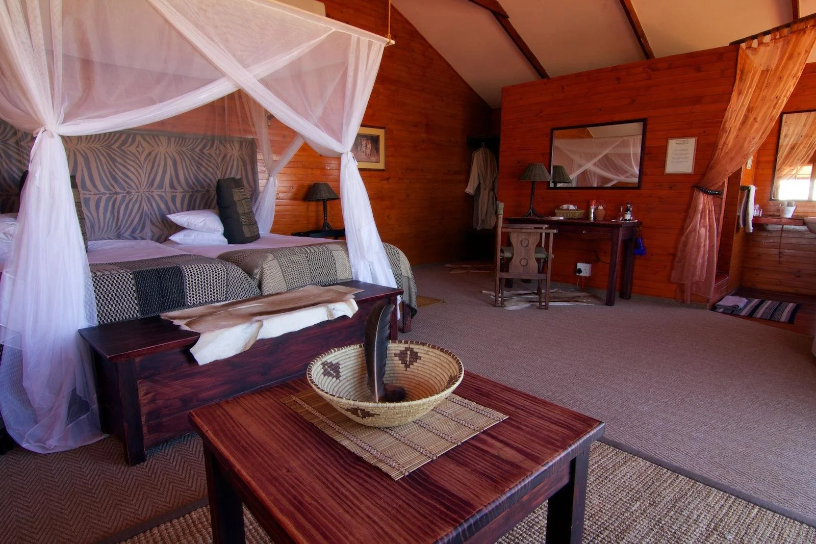 Départ en 4x4 ouvert pour une excursion dans la réserve du lodge (guide anglophone non privé). Petit-déjeuner puis route vers le Parc National d’Etosha (+-3h00). Installation et déjeuner libre. Safari en fin d’après-midi avec votre véhicule (possibilité de réserver les safaris avec guide et 4x4 du lodge en supplément). Etosha signifie en dialecte local « large étendue blanche ». Ce marais salant est un des plus remarquables du monde. Il occupe la partie centrale du parc. Sa coloration varie, selon les saisons et la quantité d’eau, du rose pâle au vert clair. Le parc comporte de nombreux points d’eau qui permettent l’observation de la faune en toute tranquillité : éléphants, rhinocéros, autruches, zèbres, gemsbok. Les fauves ne sont pas en reste : il est rare de ne pas voir de lions à Etosha ! Retour au lodge pour le repas du soir.PN EtoshaJour 04