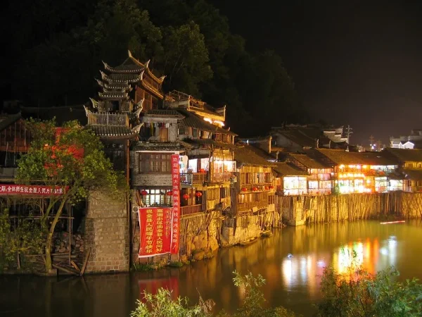 Vertrek naar Fenghuang, centrum van de Miao-minderheid. Stop onderweg bij de oude Miao stad Furong Ancient Town. De stad, schitterend gelegen in een boog rond een grote waterval, ligt aan de basis van een roman waarvan de verfilming ter plekke is gemaakt en die haar de bijnaam "De stad van de Hibiscus" heeft gegeven. Toch wordt het nog steeds weinig bezocht door westerlingen. Aankomst in Fenghuang, waar je een mooie tocht in een houten boot op de rivier kan maken (inbegrepen). ‘s Avonds kan je dineren in één van de pittoreske paalrestaurants met uitzicht op de verlichte en idyllische Tuojiang rivier.
