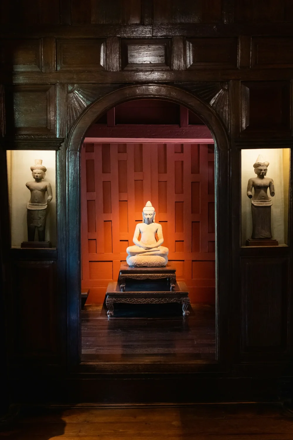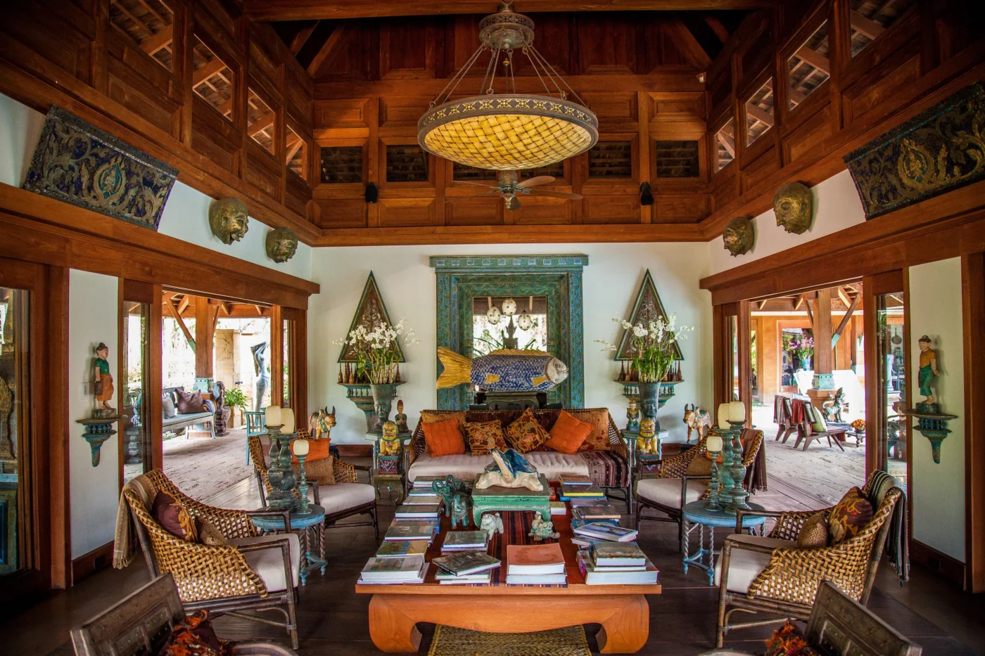 Puis départ en bateau local pour la visite de la maison de Jim Thompson, le ‘Père de la soie Thaïe’. Jim Thompson est un américain qui est venu en Thaïlande à la fin de la Seconde Guerre Mondiale pour raviver l’industrie de la soie thaïe. Sa disparition dans la jungle malaisienne demeure toujours un mystère à ce jour. La maison, construite dans le style traditionnel thaï des maisons en teck, est maintenant un musée avec une inestimable collection d’art thaï et asiatique tel que les benjarong (des porcelaines multicolore).